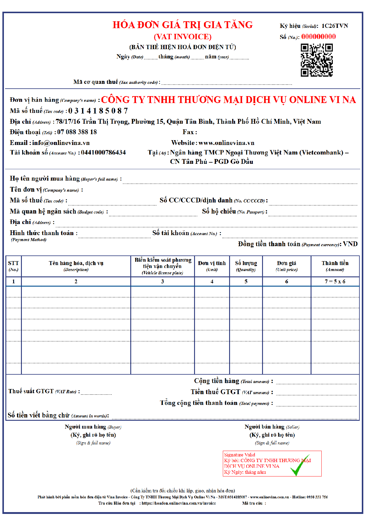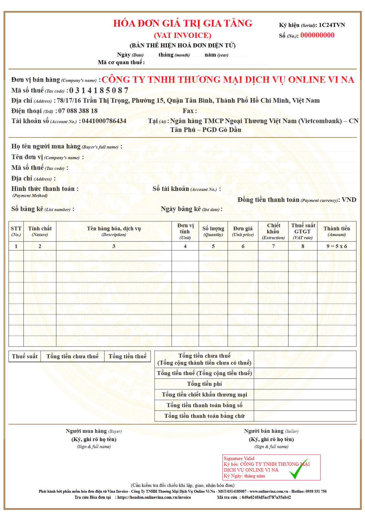 Mẫu Hoá Đơn Một Thuế Suất